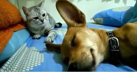 Ten pies i kot są zazwyczaj dobrymi przyjaciółmi. Tego dnia, podczas wspólnej drzemki, kot zaczął kwestionować tę głęboką przyjaźń.