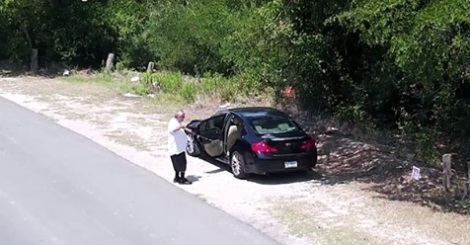 Kamery zainstalowane w hrabstwie Dallas, na poboczu drogi pokazują mężczyznę, który zatrzymuje auto i wyprowadza z niego psa.