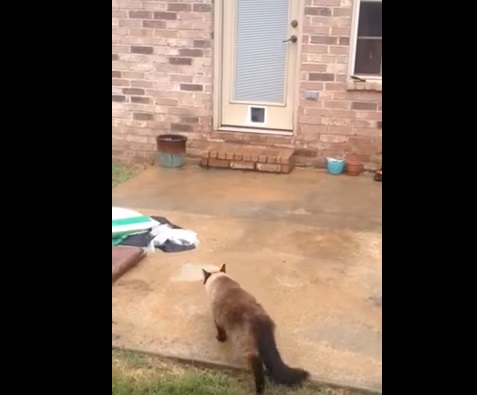 Właściciel tego kota postanowił zainstalować specjalne drzwiczki dla swojego czworonoga, aby ten mógł w każdej chwili wyjśc na zewnątrz i wejść do środka.