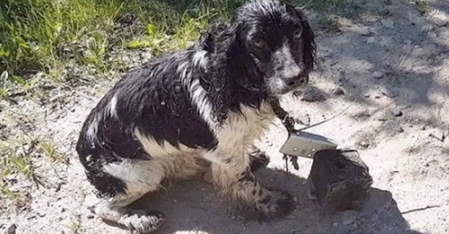 Pies całkowicie przemoczony i drżący, miał coś wielkiego, metalowego i ciężkiego przyczepionego do szyi.