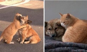 Bezdomny kot pociesza porzuconego psa- poruszająca scena