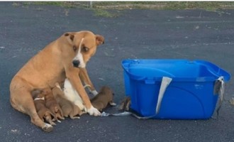 Przestraszony pies porzucony na parkingu z dziewięcioma 2-tygodniowymi szczeniakami