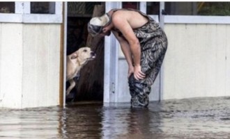 Piesek nie chce rozstać się z człowiekiem, który uratował go w czasie powodzi