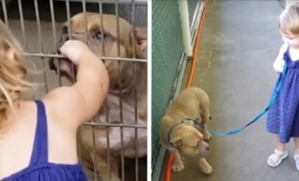 Mała dziewczynka zbliża się do chorego pitbulla w schronisku- wzruszający moment