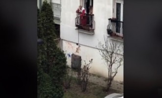 Kobieta wyprowadza psa z balkonu- niebezpieczne zachowanie