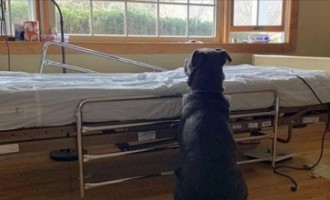 Załamany adoptowany pies czeka przy łóżku zmarłego właściciela