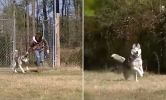 Po spędzeniu całego życia na łańcuchu husky w końcu biegnie po trawie