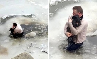 Mężczyzna widzi przerażonego psa, który utknął w zamarzniętej wodzie i ryzykuje własne życie, aby go ratować