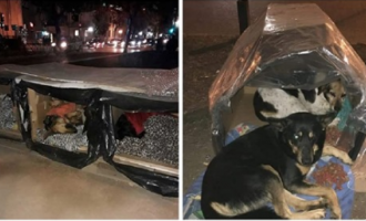 Anonimowi bohaterowie stawiają na ulicach izolowane kartony, aby chronić bezdomne psy przed zimnem w nocy