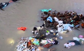 Ten pies próbuje ocalić swoje szczeniaki przepływając przez zalaną ulicę- poruszajacy moment