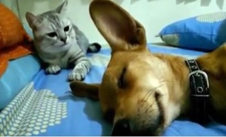 Pies pryka podczas snu - reakcja kota jest przezabawna