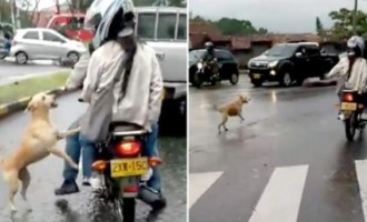 Porzucili psa na środku drogi i próbują uciec. Pies biegnie za nimi między samochodami.