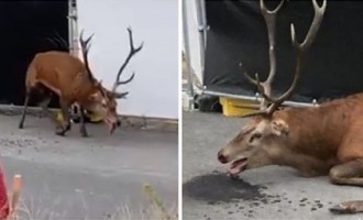 Jeleń pada wyczerpany po ściganiu go przez myśliwych i ich psy ale sąsiedzi interweniują
