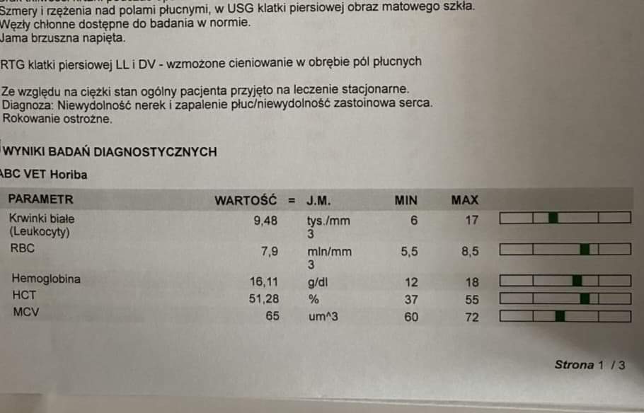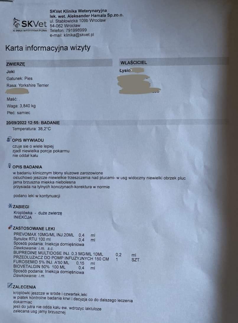 Piszę to ze łzami w oczach, po kolejnej nocy spędzonej na ostrym dyżurze czekając na informację czy piesek przeżyje noc. Na wszystkich zdjęciach znajduje się ten sam piesek, nazywa się Dżoki i ma 12 lat. Miesiąc temu zdiagnozowano u niego przewlekłą niewydolność nerek oraz silny obrzęk płuc. Piesek cierpi bo mimo leków jego stan jest ciężki a z powodu niewydolności nerek nie może przyjmować leków przeciwzapalnych. Wymaga podpięcia do tlenu, codziennych kroplówek oraz leków dożylnych. Jest to jednak jedynie leczenie objawów, choroba wciąż postępuje. W tym momencie piesek nie jest już w stanie stać o własnych siłach. Jego ostatnią szansą jest przeszczep komórek macierzystych. Przeszczep stymuluje organizm do odbudowy uszkodzonego narządu, poprzez wykorzystanie komórek macierzystych pieska pozyskanych z jego tkanki tłuszczowej. Terapia daje szybką poprawę i nie powoduje skutków ubocznych.