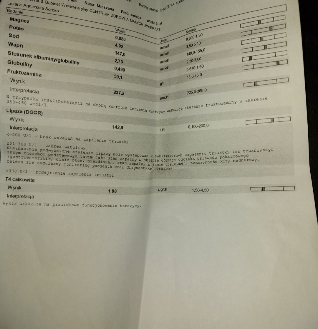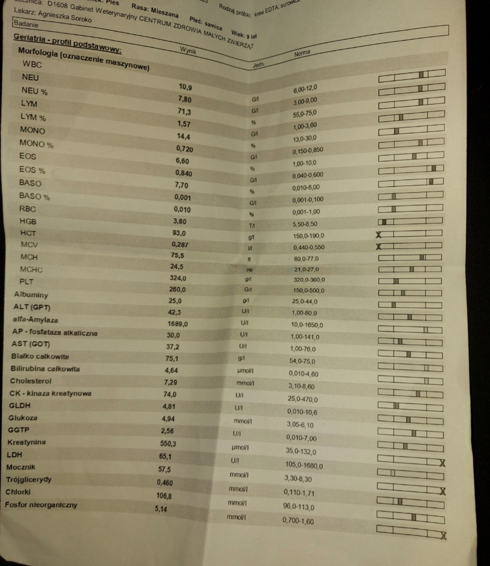Z wyników badań widać, że Misia ma znacznie podwyższony poziom kreatyniny oraz mocznika we krwi, co oznacza, że cierpi na przewlekłą niewydolność nerek (PNN), która choć może być leczona skutecznie i łagodząco, jednak kończy się śmiercią, a bez leczenia i opieki paliatywnej w późniejszej fazie - w męczarniach.