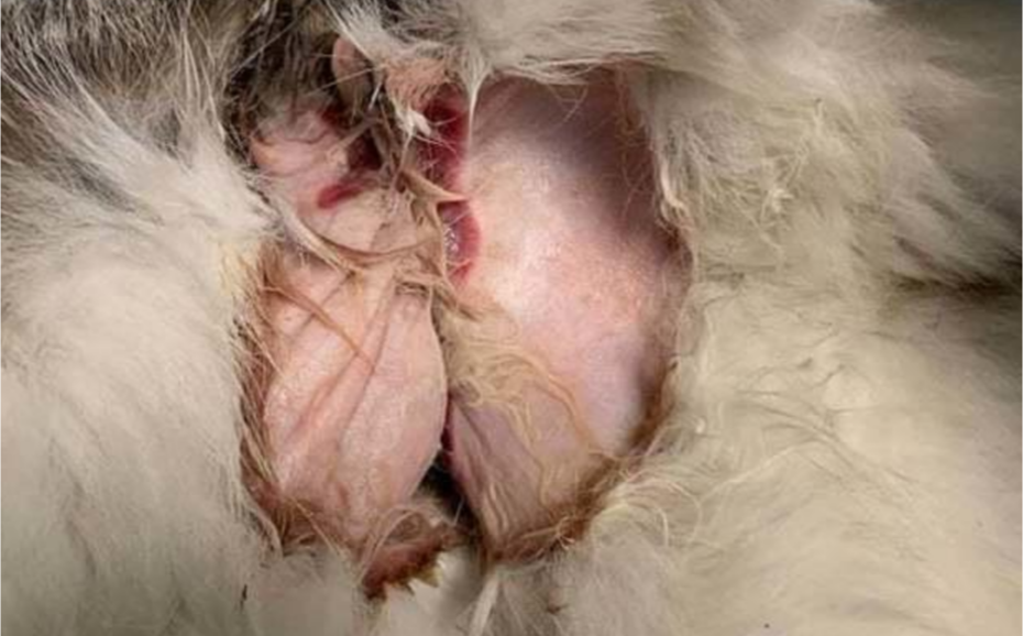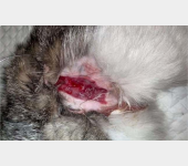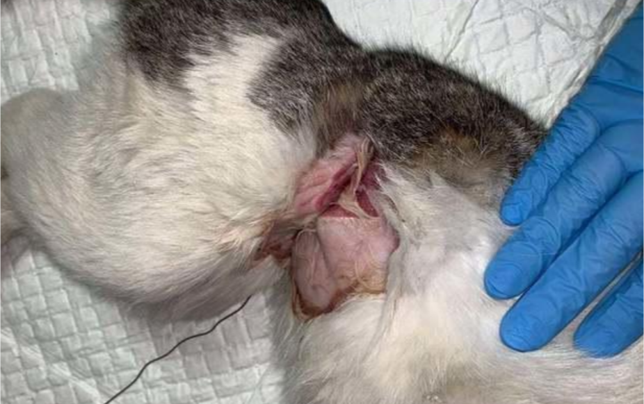 Sztywny drut owinięty kilka razy wokół brzucha, dodatkowo sterczący na 40 cm. Takie druty używane są zazwyczaj przez kłusowników do bestialskiego zabijania zwierząt. Pułapka, z której rzadko które zwierzę wychodzi żywe. Niewyobrażalny ból, bo z każdym ruchem narzędzie tortur coraz bardziej zaciskało się na chudym kocim ciałku... Warstwa skóry została szybko przecięta. Drut nie ustępował, próbując przeciąć biednego kociaka na pół.... Brak słów, na myśl, że wiele zwierząt jest zabijana właśnie w tak bestialski sposób. Rana była już zakażona, a uszkodzone tkani zaczęły się rozkładać. Po wyplątaniu kota, rana miała ponad 3 cm szerokości. Drut zaczął wbijać się w narządy wewnętrzne. Pomoc nadeszła w ostatniej chwili!. Kociak był dziki, bał się podejść do ludzi, dlatego potrzebna była pomoc klatki- łapki. Całe szczęście wygłodniały kot szybko dał się złapać.