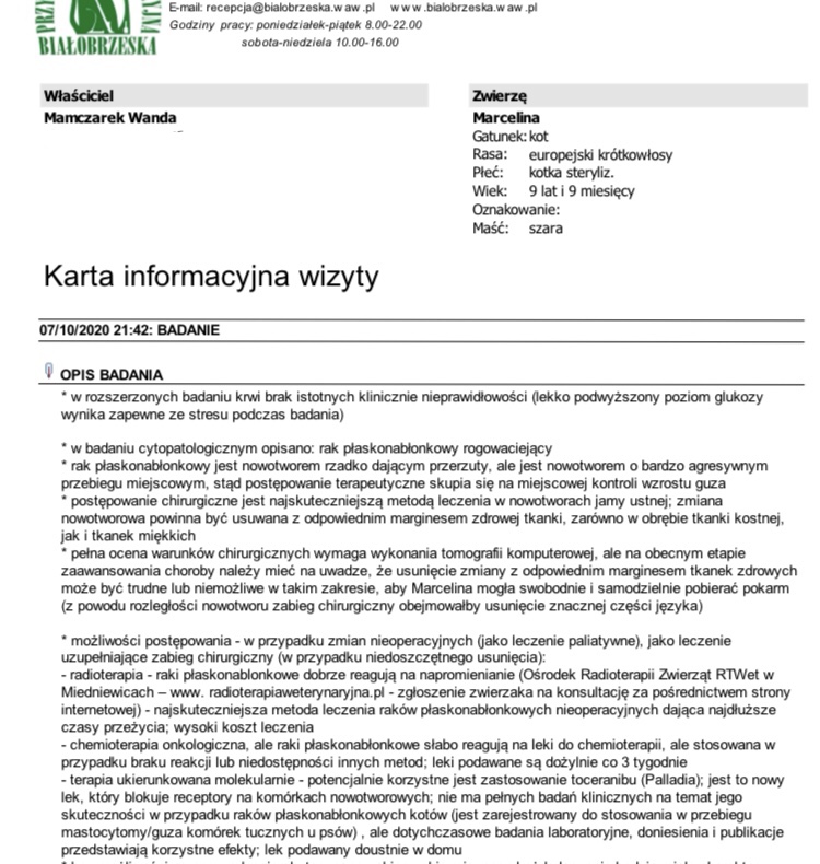 Na zabieg chirurgiczny jest za późno jedyny sposobem jest radioterapia na świetlenie języka od 2 do 3 tygodni niestety koszt tych zabiegów to 15 tysięcy moja mama nie może mi pomóc nie stać ją na ten zabieg chodź walczy o moje życie na tyle ile ją stać.lekarz. Weterynarz powiedział ze czym szybsza będzie zastosowana terapia to mam większe szanse