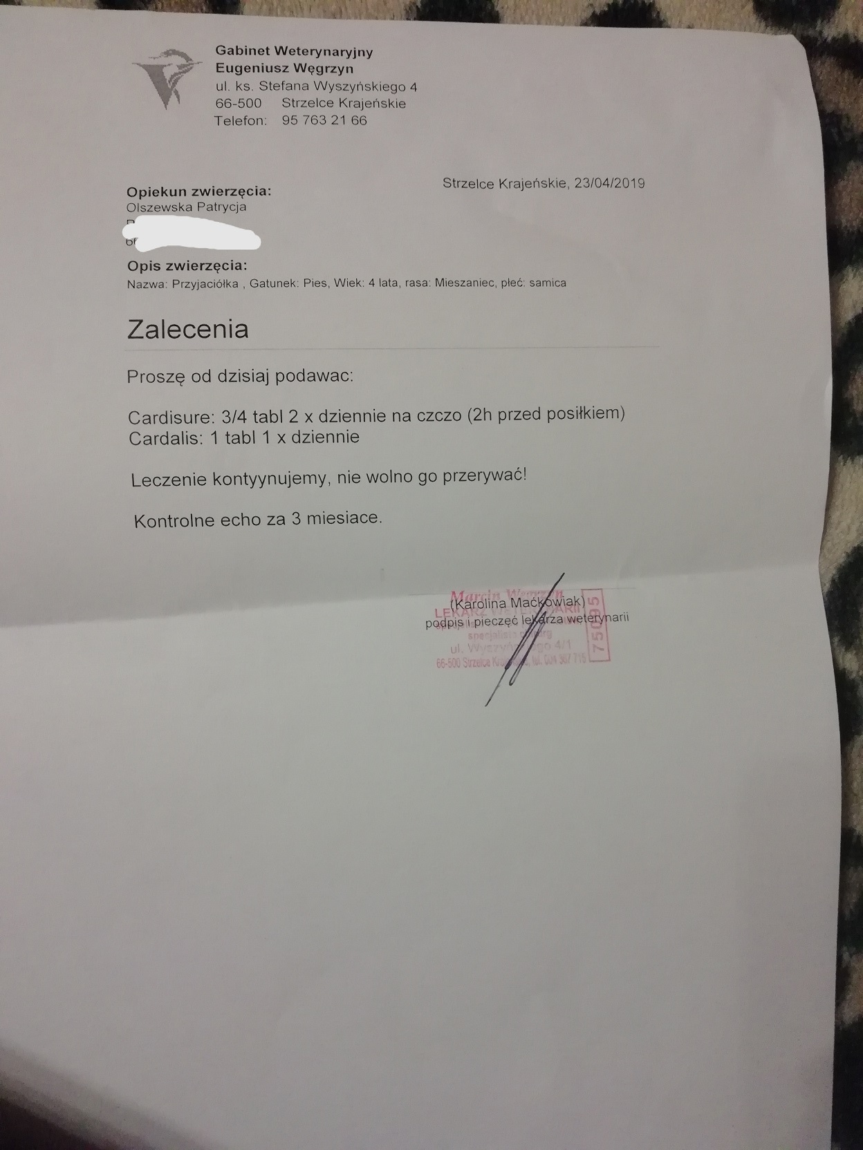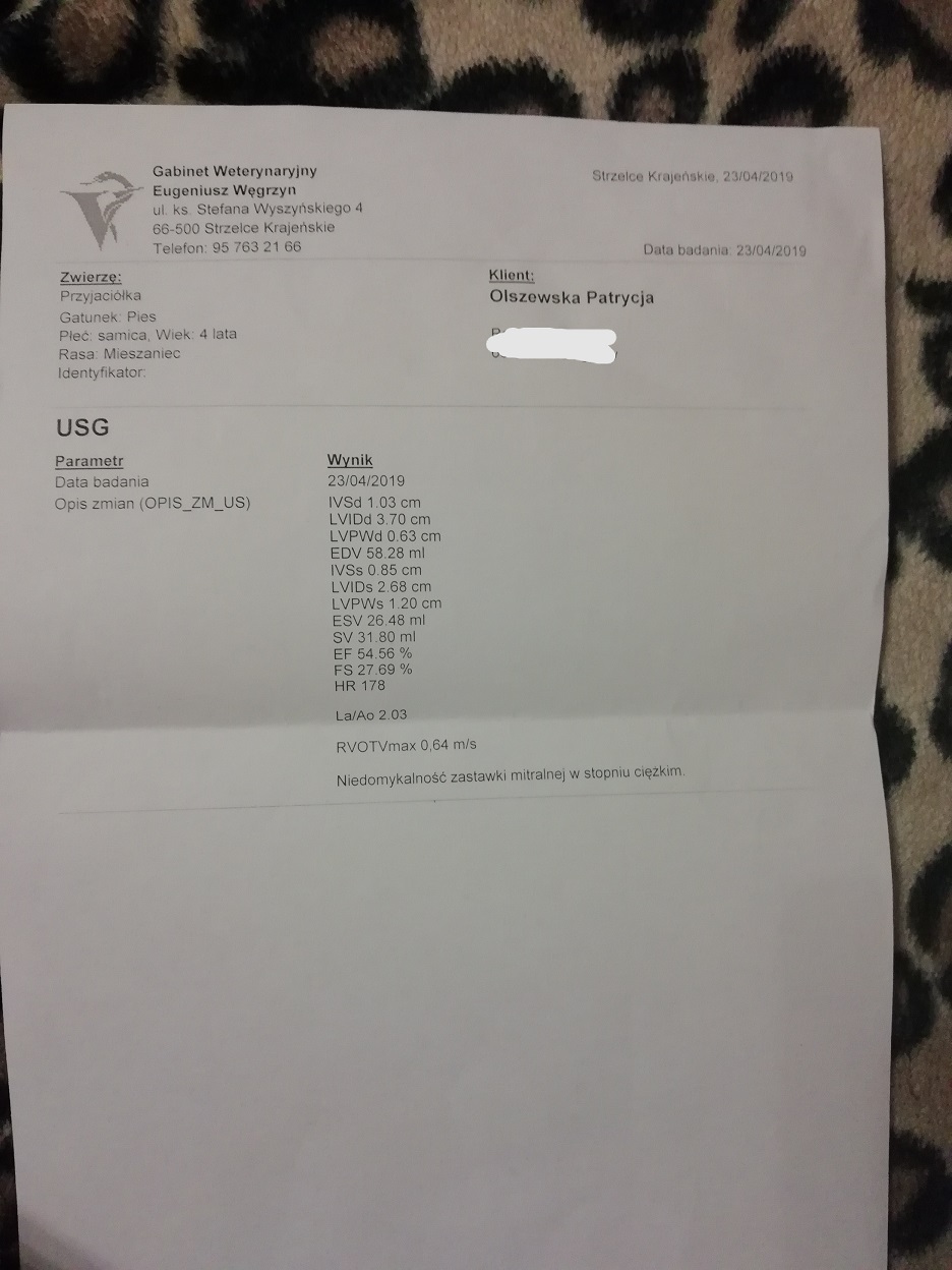 Przyjaciółke adoptowaliśmy wraz z partnerem 1 grudnia 2018 roku ze schroniska w Młodolinie. Dlaczego właśnie ona? A no dlatego,że 1,5 miesiąca wcześniej,gdy Andrzej wracał z pracy nasza pani wpadła by mu pod koła samochodu. Zatrzymał się by jej pomóc ale okazało się że jest nieufna i najprawdopodobniej wyrzucona z innego samochodu. Przez kolejne 3 tygodnie 2 razy dziennie jeździliśmy codziennie w to miejsce by dać jej coś ciepłego do jedzenia i pić ponieważ była mroźna pogoda no i przy okazji ją do nas przyzwyczajać by nam zaufała i pozwoliła zabrać siebie z tego miejsca przy bardzo ruchliwej drodze. W końcu się udało i przy współpracy ze schroniskiem nasza pani jest już w bezpiecznym miejscu jakim jest schronisko w Młodolinie. Po okresie kwarantanny i niezbędnych szczepieniach zabieramy ją do domku. Niestety dzień 17 kwietnia tego roku był dla nas bardzo przykrym dniem.Przyjaciółka zaczyna czuć się bardzo źle.Bez chwili zastanowienia zabieramy ją do weterynarza szereg różnych badań takich jak rtg jamy brzusznej,badanie krwi,kału,echo serca i najgorsze co może usłyszeć każdy właściciel swojego ukochanego pupila.. WADA SERCA W STOPNIU CIĘŻKIM... TERAZ BY PRZYJACIÓŁKA MOGŁA POŻYĆ Z NAMI JESZCZE PARĘ ŁADNYCH LAT POTRZEBNE JEST LECZENIE NA KTÓRE MNIE NIE STAĆ Z UWAGI NA TO,ŻE MAM CHORE DZIECKO RÓWNIEŻ NA SERDUSZKO I JEGO LECZENIE POCHŁANIA MNÓSTWO ŚRODKÓW. PLUS DO TEGO RAZ N 2 MIESIĄCE MUSZĘ BYĆ Z NIM NA KONTROLI W SZCZECINIE.. PROSZĘ WIĘC O POMOC W ZAKUPIE LEKÓW NA SERDUSZKO I SFINANSOWANIE KOLEJNEGO BADANIA KONTROLNEGO W LIPCU.W ZAŁĄCZENIU PRZEDSTAWIAM ZDJĘCIA Z BADAŃ ORAZ JAKIE LEKI MA PRZYJMOWAĆ I KOSZTA DOTYCHCZASOWE JAKIE PONIEŚLIŚMY... KOSZT TABLETEK JAKIE MUSI PRZYJMOWAĆ TO 200 ZŁ MIESIĘCZNIE PLUS KOSZT BADANIA 125 ZŁ CHCIAŁA BYM JĄ ZABEZPIECZYĆ CHOCIAŻ NA 5 MIESIĘCY BYŚMY MOGLI SPAĆ SPOKOJNIE I NIE MYŚLEC CZY NA PRZYSZŁY MIESIĄC BĘDĘ MOGŁA KUPIĆ JEJ LEKI...z GÓRY DZIĘKUJE ZA WASZE DOBRE SERDUCHA>>>