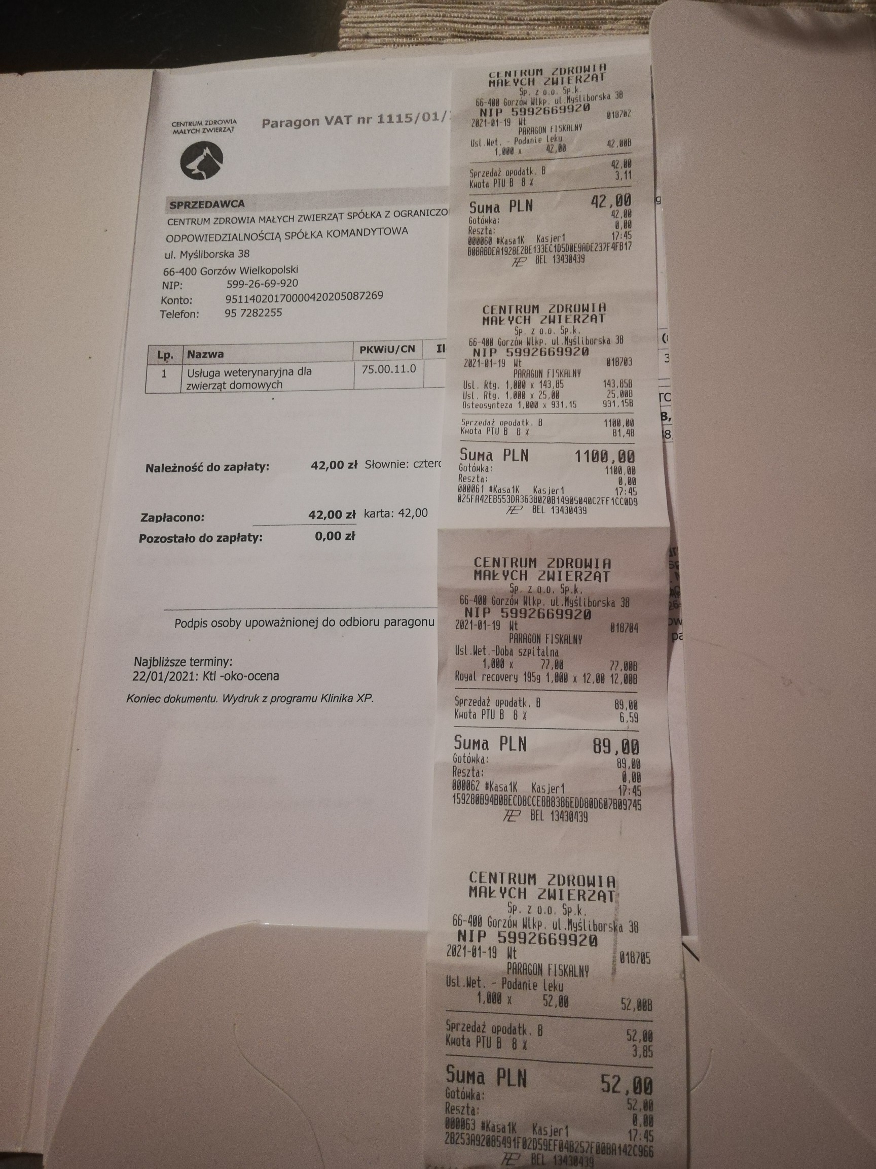 JEDNA MAŁA PUSZECZKA 195g , POSIŁKU KOSZTUJE 12 zł. NASTĘPNA WIZYTA U WETERYNARZA JEST W PIĄTEK.