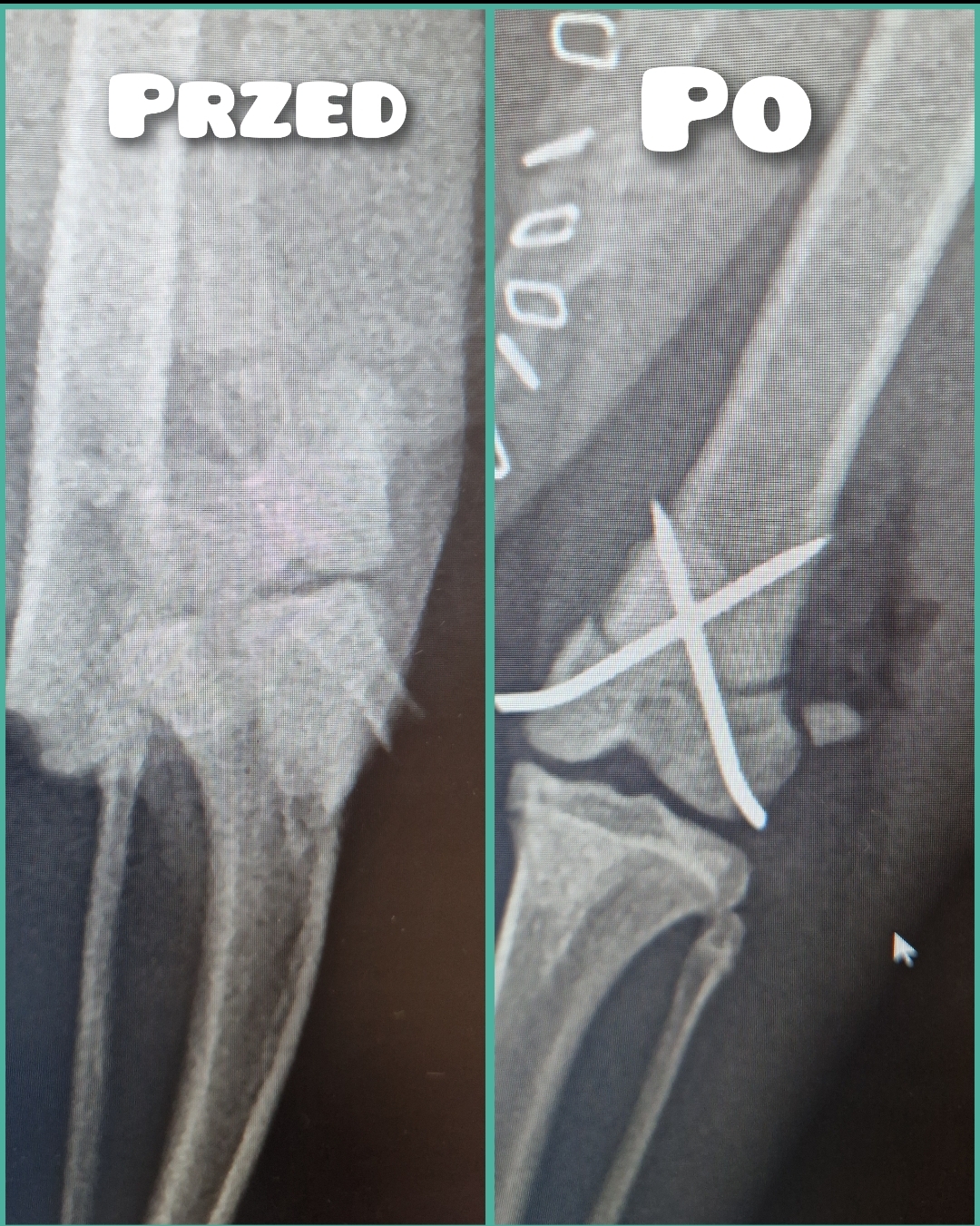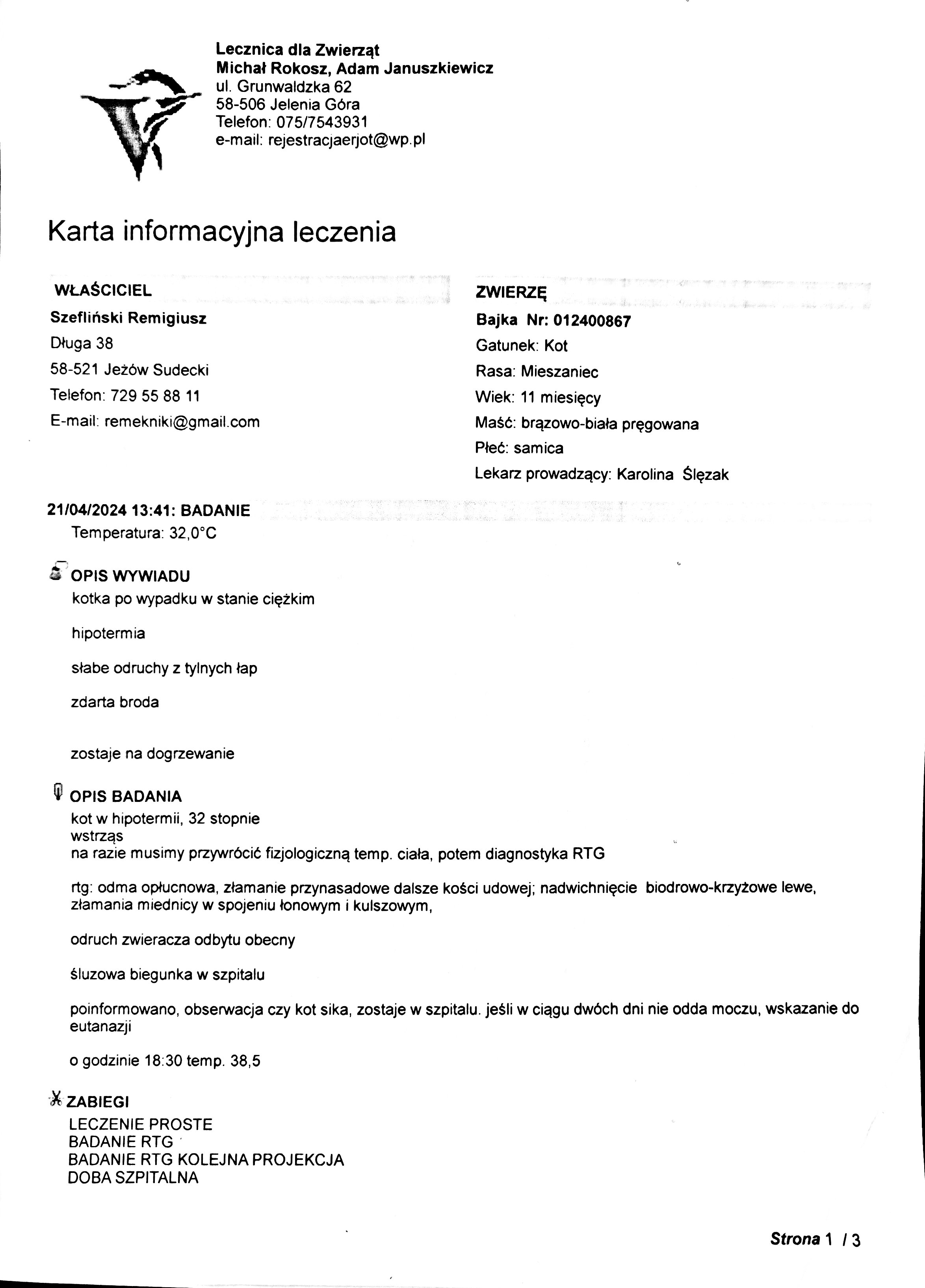 Kochani, dzięki Waszym wielkim sercom Bajka dziś pomyślnie przeszła operację - DZIĘKUJEMY ????♥️???? Wielkie brawa dla lekarzy z lecznicy Cztery Łapy w Jeleniej Górze ! Koszt operacji wyniósł 3260 PLN plus każdorazowa wizyta kontrolna 30 PLN plus koszty dodatkowe za miesiąc, tj. wyjęcie śrub, leki, rehabilitacja. Dziś zapłaciłem 3000 PLN, załączam rachunek. Następne załączę przy kolejnych opłatach. Bajka wysyła miaubuźki (. ❛ ᴗ ❛.)