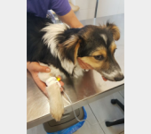 Wzięliśmy go ze sobą. Piesek był bardzo osłabiony, spragniony, głodny i wycieńczony. To znacznie osłabiło jego system odpornościowy, przebywał w lesie i na łąkach, był więc narażony na atak kleszczy... a sezon w pełni jak wiemy. Dwa dni temu jego stan bardzo się pogorszył. W stanie krytycznym trafił do lecznicy na kroplówki i leczenie. Obecnie jest już stabilnie ale walczymy o każdy kolejny dzień!