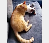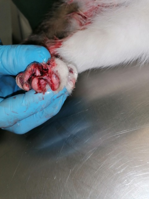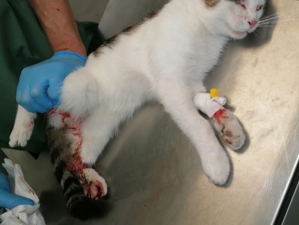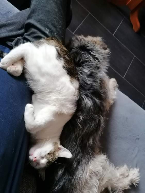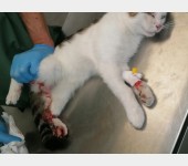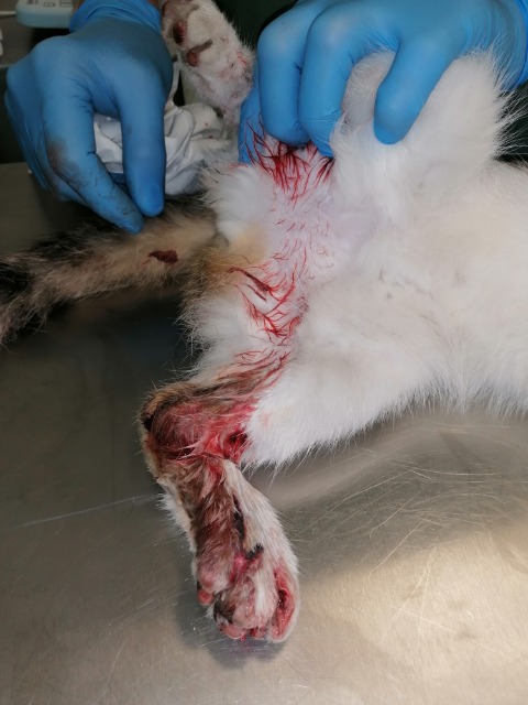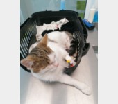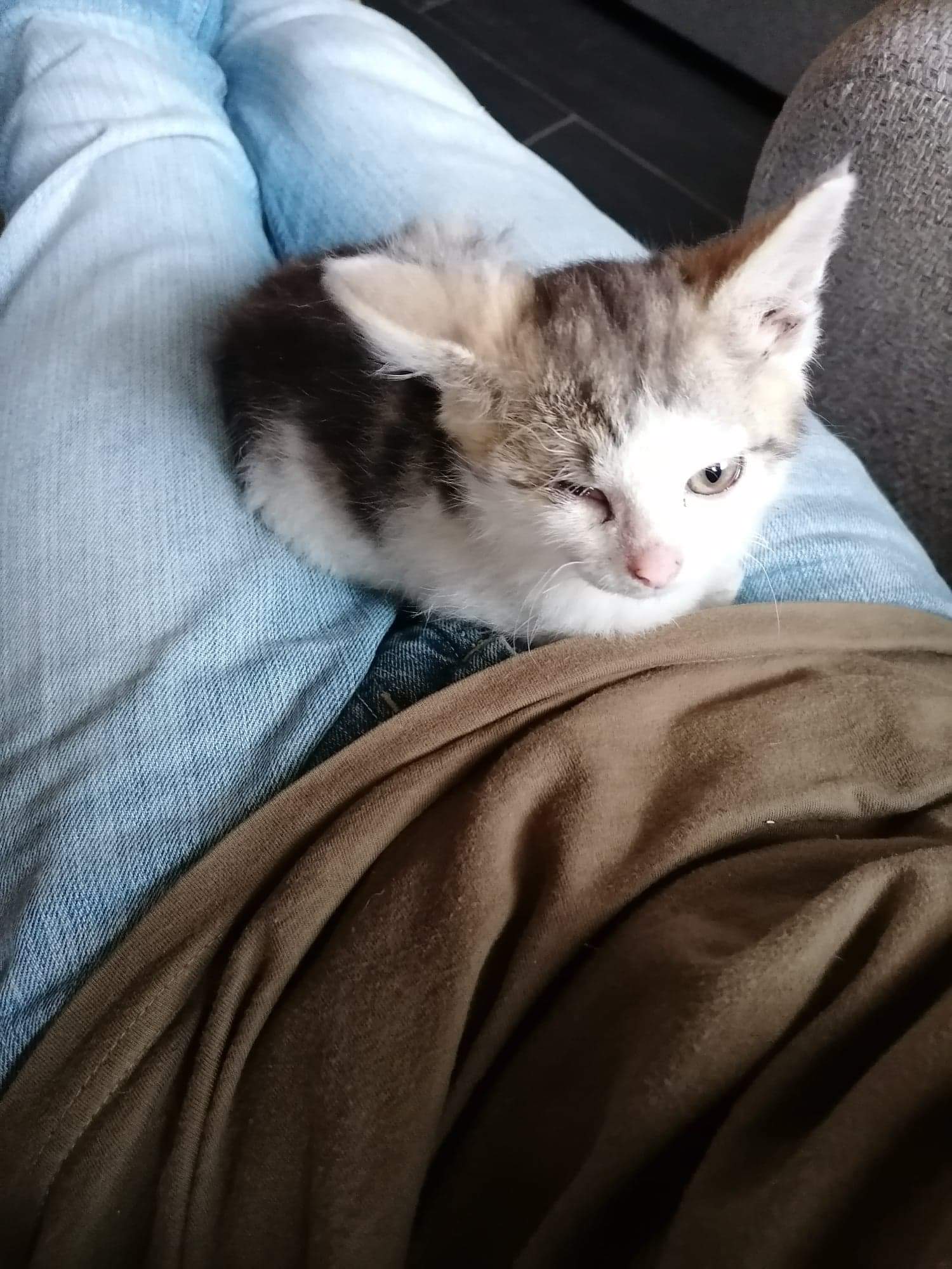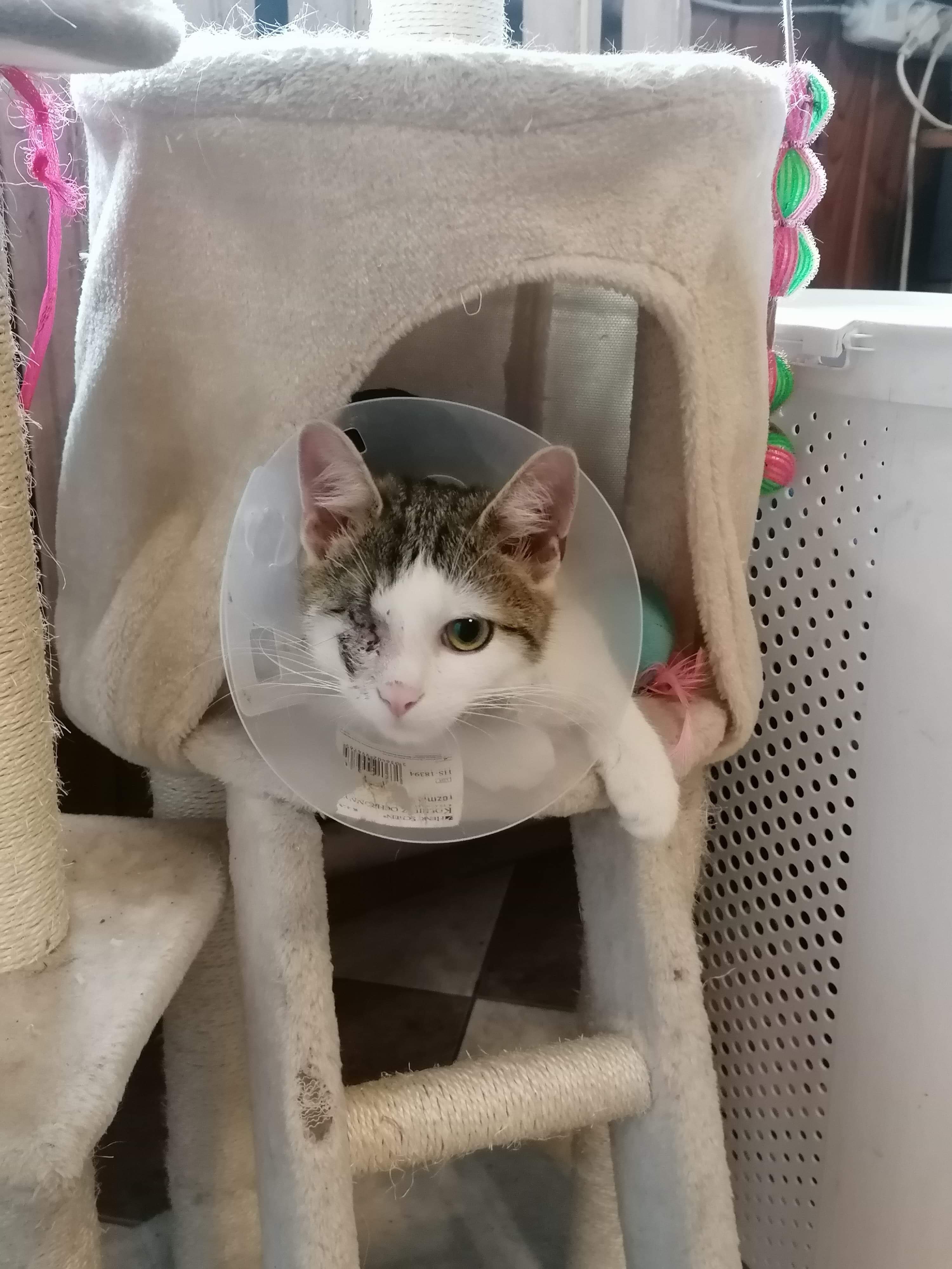 Kajtek nie miał łatwego życia. Znaleźliśmy go w pudle. Był w dramatycznym stanie. Najmniejszy i najsłabszy że stada... a mimo to najbardziej się łasił i lgnął do człowieka. Przez koci katar pękło i wypłynęło mu oczko. Wymagał opieki, zakraplania, masowania. Postanowiliśmy, że zostanie u nas, w domu tymczasowym, na stałe. Kiedy podrósł wymagał dwóch operacji: oka oraz migrującego jądra. Przeszedł je całkiem niedawno. Teraz znów uległ wypadkowi...