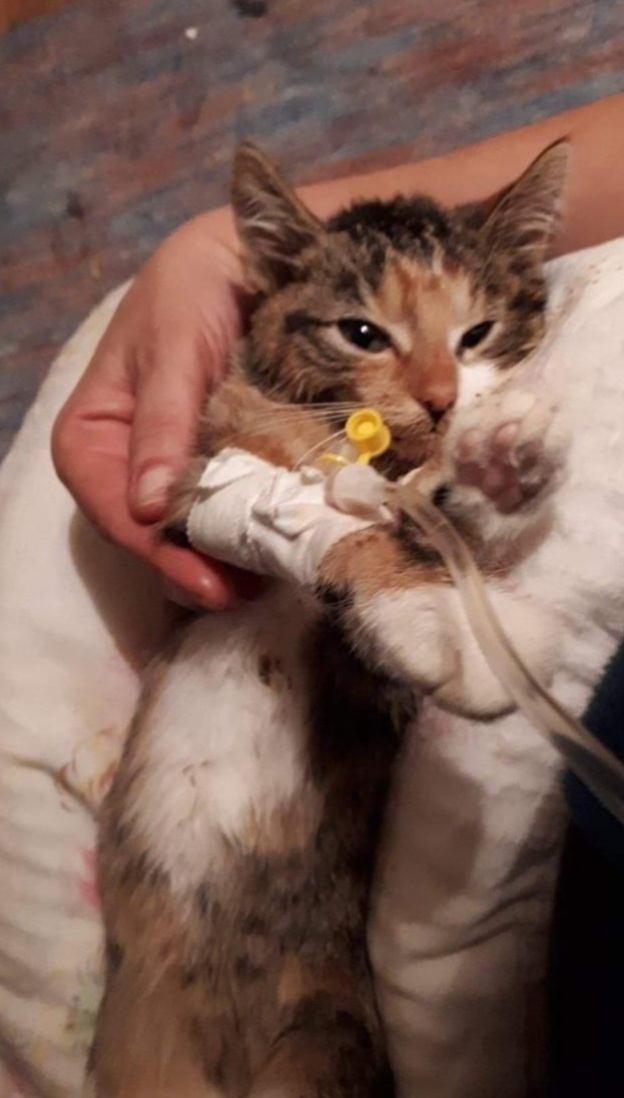 Wstępne badania nie wykazały na szczęście żadnych obrażeń, koteczka była trochę obolała i bardzo, bardzo głodna. Niestety kotka, nie cieszyła sie dobrą kondycją, nagle zaczęła wymiotować i mieć krwiste biegunki, nie jadła, przestała pić, stała się cieniem kota. Wykonany w przychodni test wykazał najniebezpieczniejszą kocią chorobę zakaźną, wysoce zaraźliwą i w wielu przypadkach śmiertelną - panleukopenię.Koteczka dostała całą baterię leków, kroplówek i wróciła do domu. Z dobrze wyglądającej koteczki stała się kocim szkieletem. W domu tylko leżała, męczyły ją napady wymiotów i wyniszczające biegunki. Na szczęście nastąpił przełom - kotka powoli, powoli, odzyskuje siły. Zaczyna sama jeść. Nie jest to jednak koniec leczenia, nadal musimy ją leczyć i żyjemy w strachu o jej zdrowie. Prosimy o pomoc w ratowaniu tej małej, dzielnej koteczka.