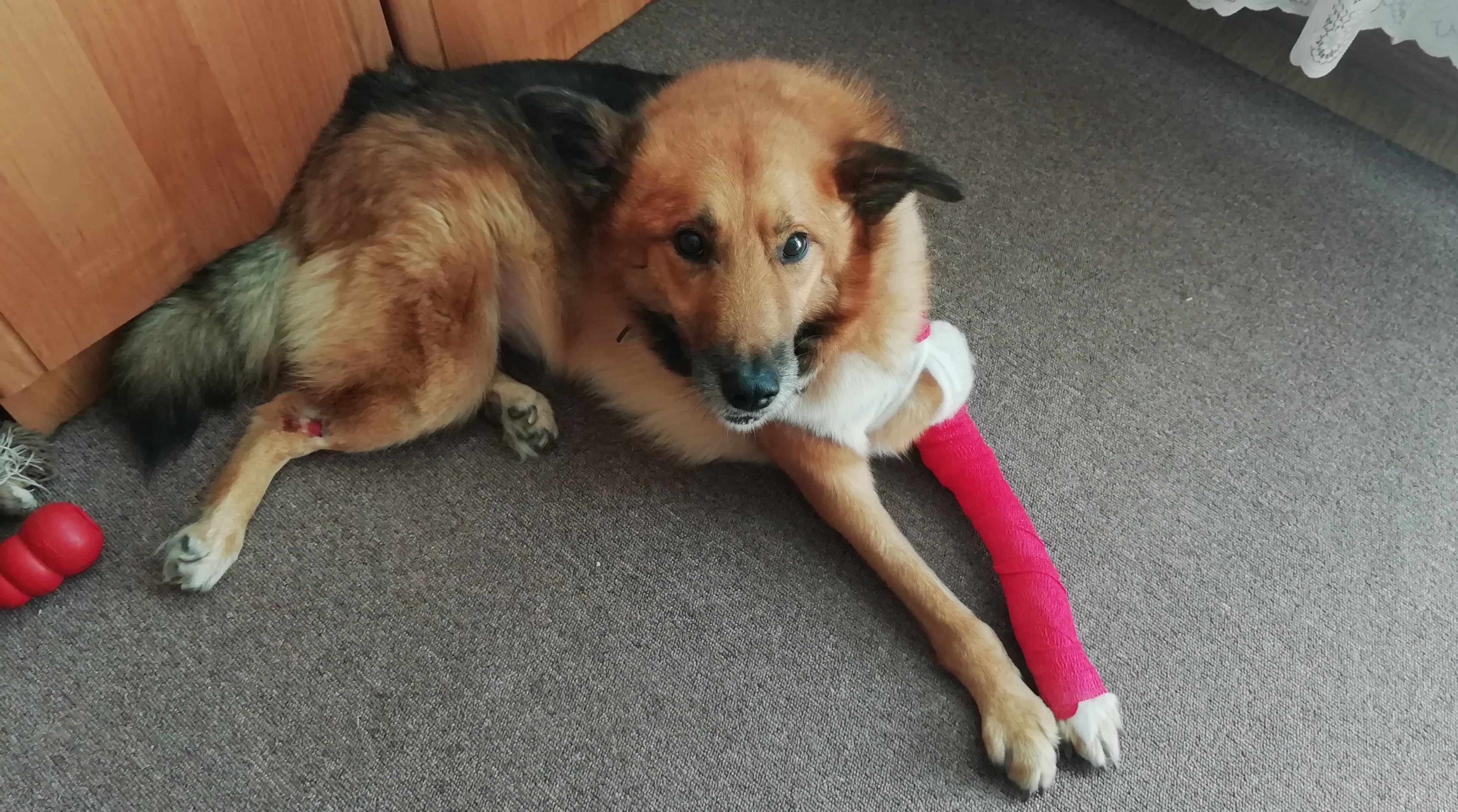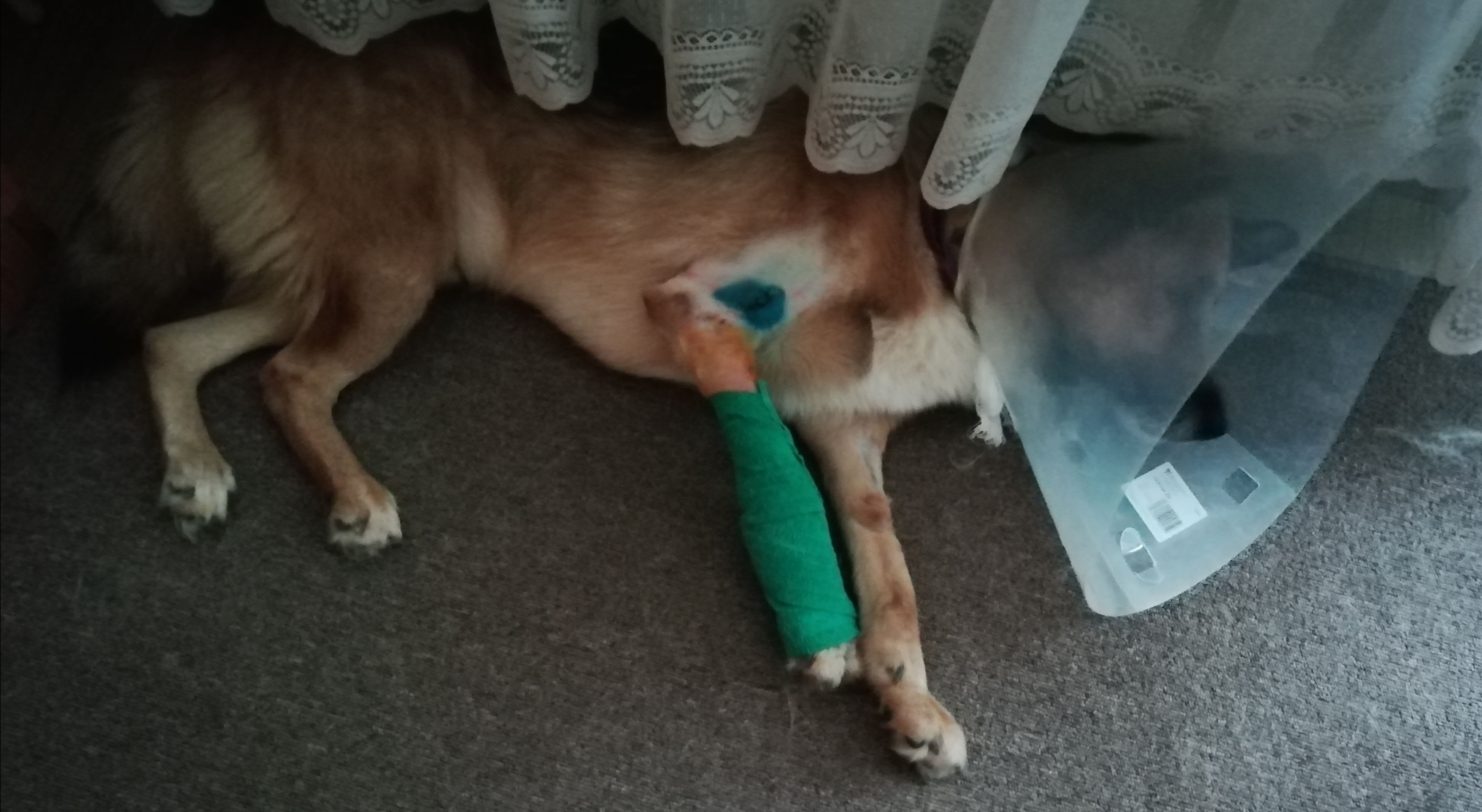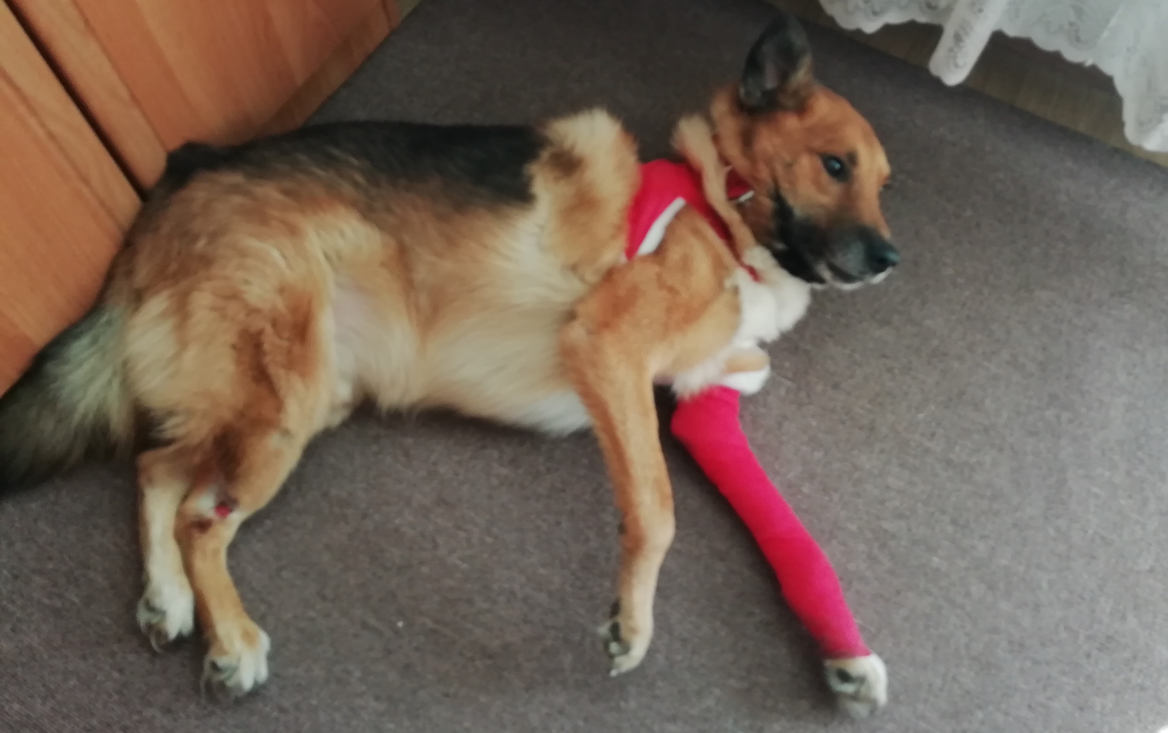 Obecnie Leoś jest po operacji łapy przedniej lewej co ilustrują zdjęcia.