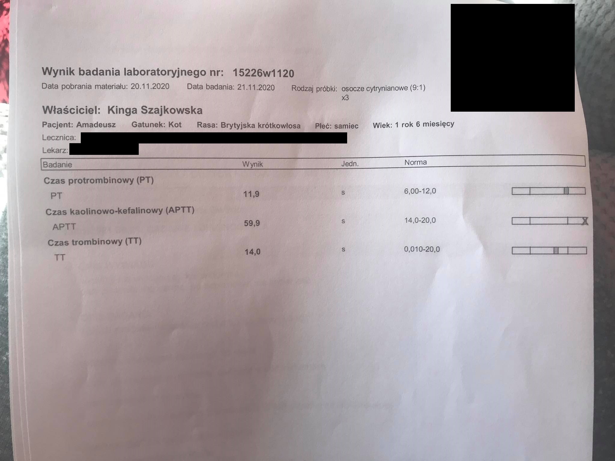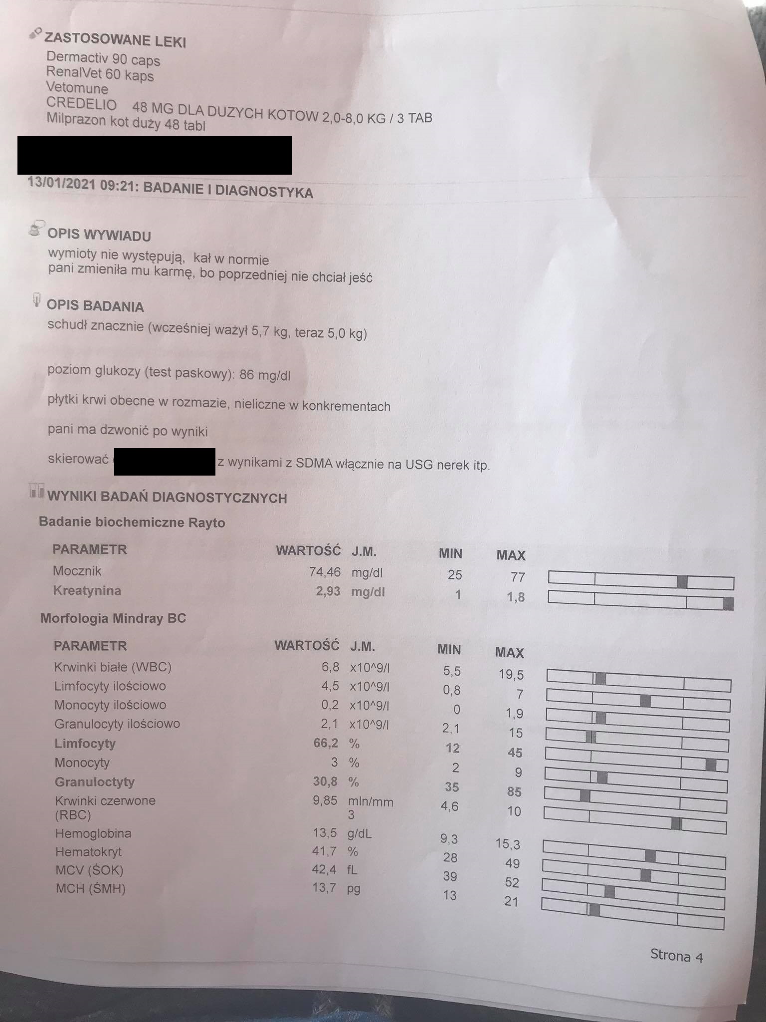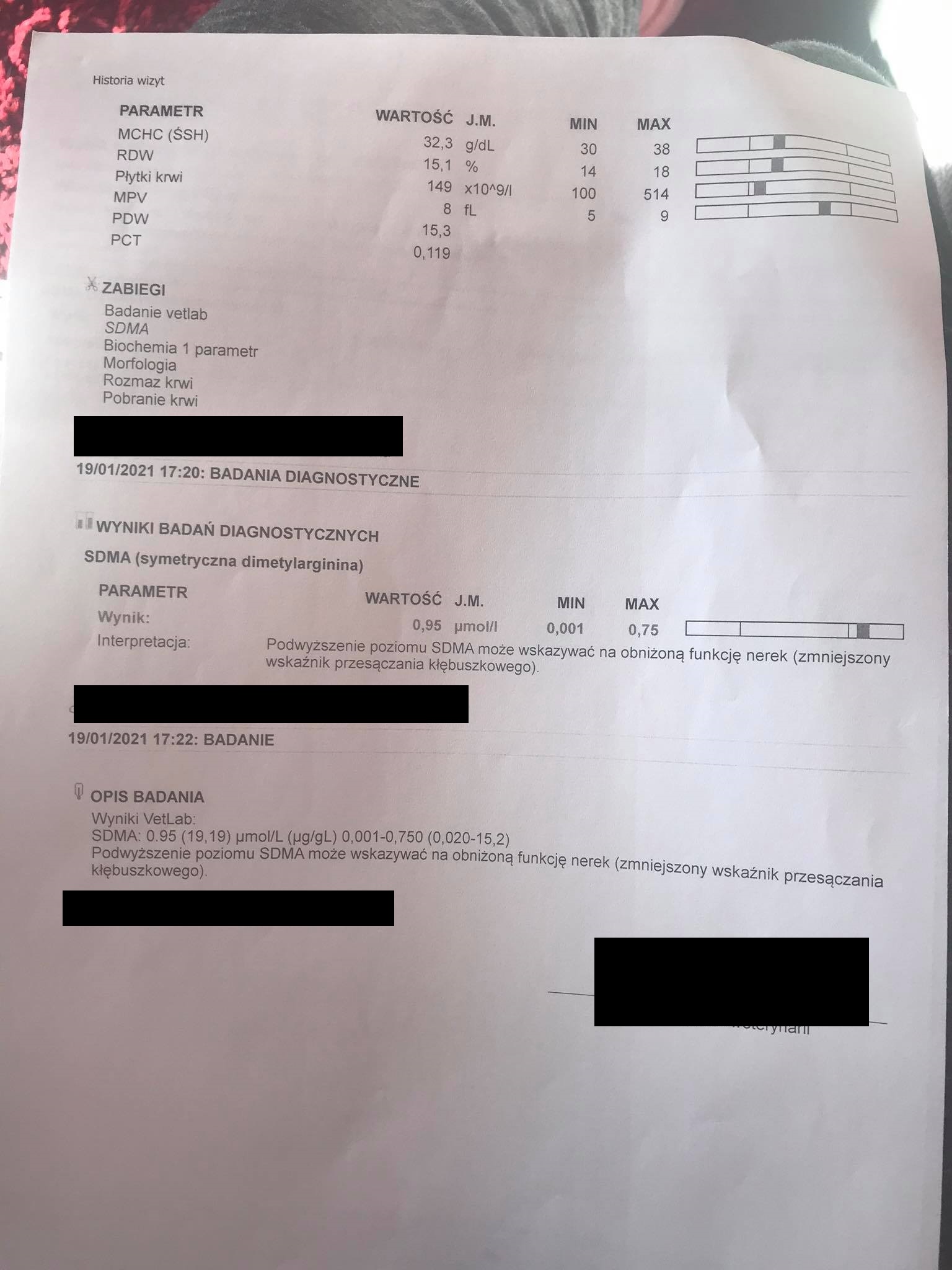 Dzięki poprzedniej zbiórce, która przerosła Nasze najśmielsze oczekiwania pod względem szybkości (za którą jesteśmy ogromnie wdzięczni), udało się Nam w jakimś stopniu pokryć koszty pierwszych badań (biochemii, morfologii, badań moczu, echo serca, leków na nerki, badań na tarczycę, badań na krzepliwość krwi, badań SDMA).
