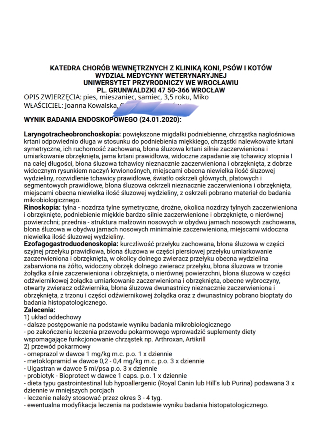 U mojego psiaka została postawiona diagnoza podejrzenia przewlekłego nieżytu noska. Na to badanie skierowali nas do Wrocławia do najlepszych weterynarzy na wykonanie rinhoskopii nosa.