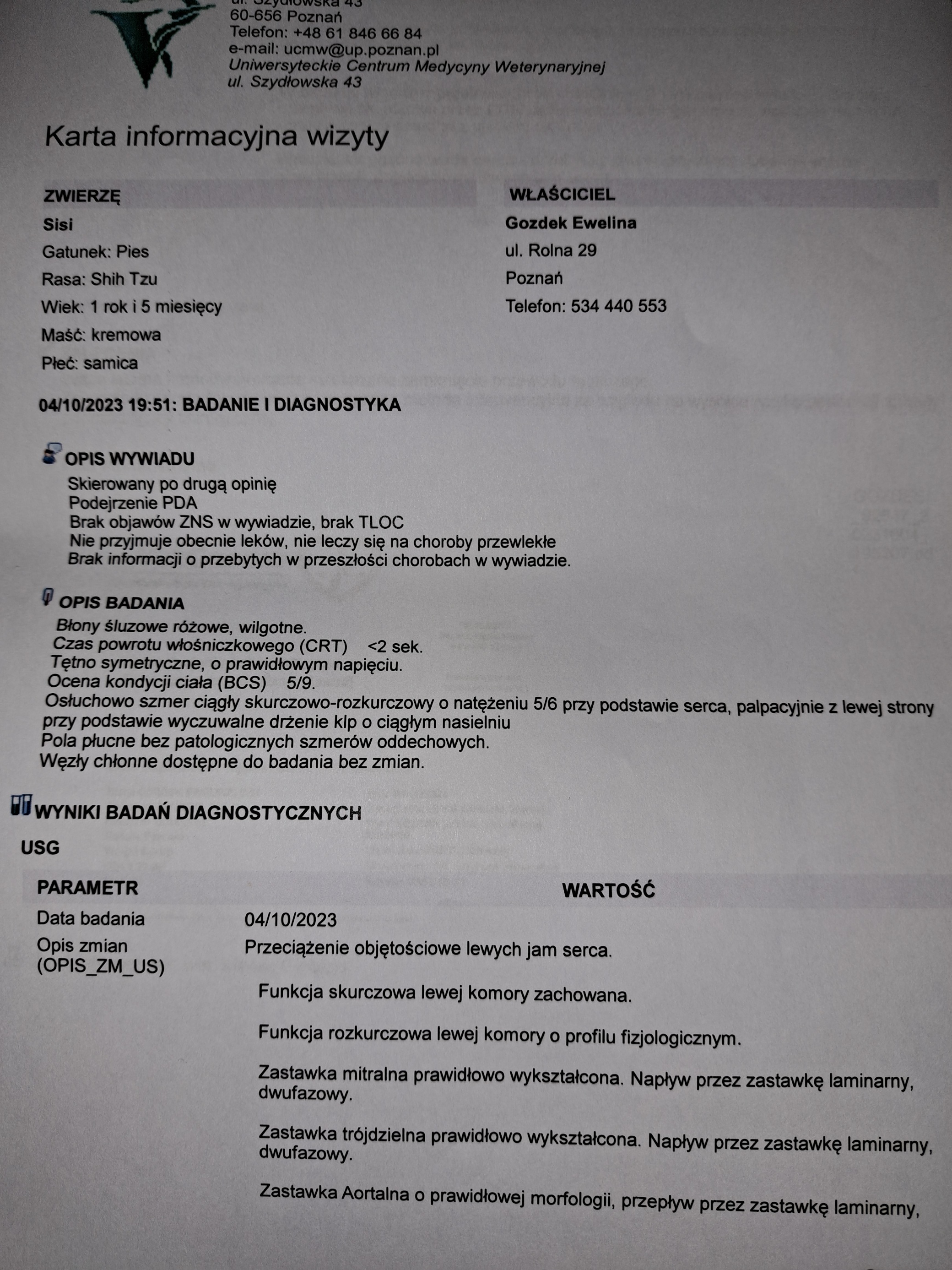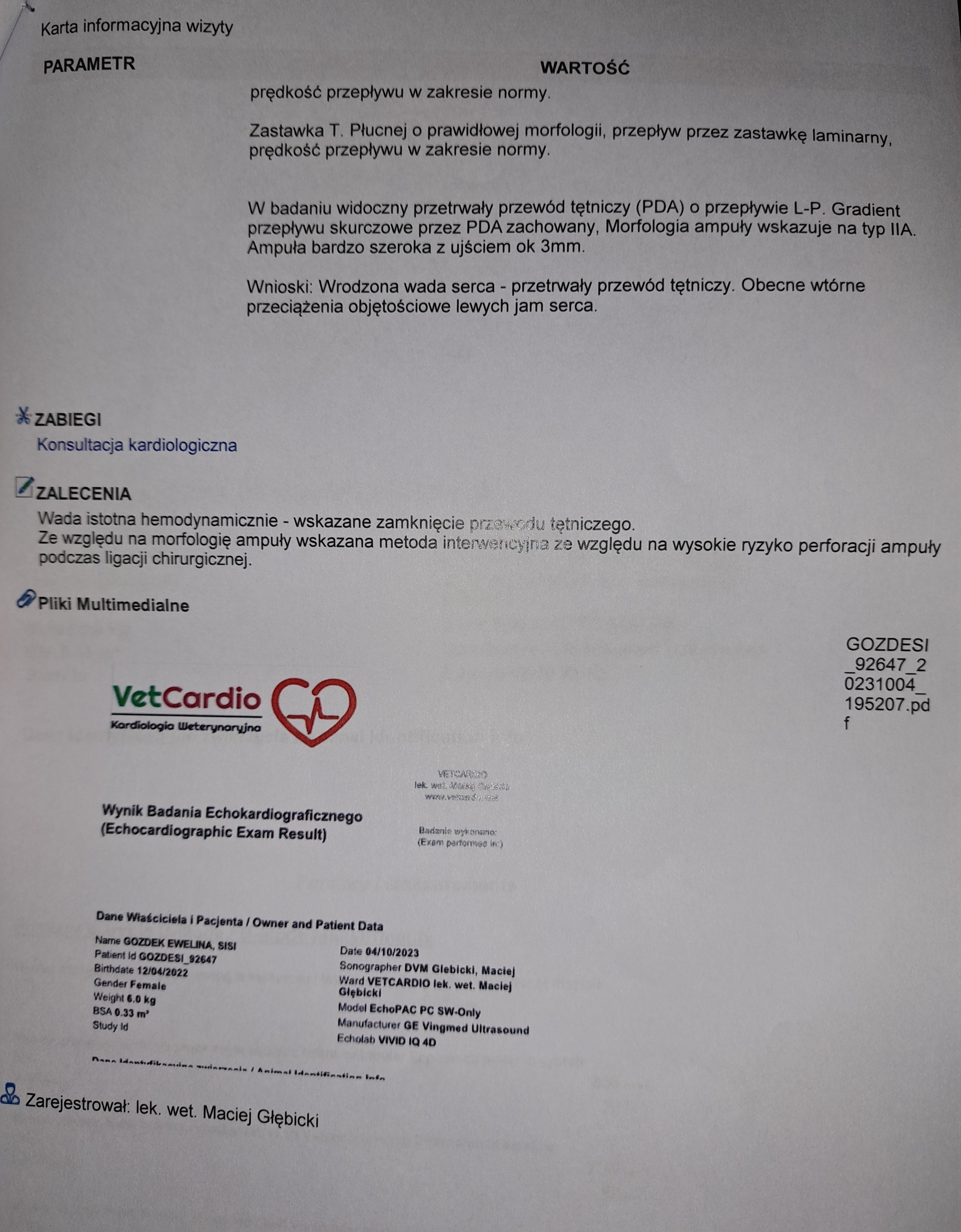 U nas w Poznaniu nie wykonują tak skomplikowanych zabiegów i znalazł się dobry Pan doktor z Wrocławia który może uratować moje życie ale koszty które moja Pani musi pokryć są bardzo duże ,a sama diagnostyka byla dla mojej Pani wyzwaniem ..Koszt mojego życia to około 9 tysięcy złotych, muszę mieć specjalny zabieg bo chirurgicznego otwarcia klatki piersiowej mogłabym nie przeżyć , czeka mnie podróż i znowu kolejne wizyty u weterynarzana których moja Pani zwyczajnie nie da rady udźwignac bo nie ma tyle pieniążków. Pomóż mi prosze cieszyć się dalej życiem i latać za piłeczką jak na zdrowego pieska przystało.