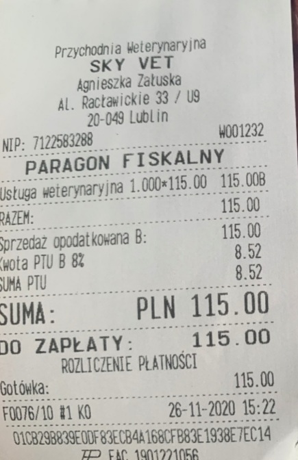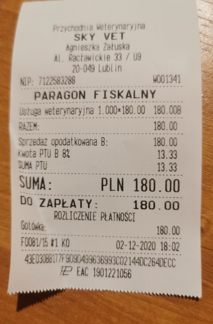 Jeszcze nie wiem jaka będzie cena za podanie surowicy 3 kotom, do tej pory wydałam na leczenie maluszka 720zł, dziś jedziemy na kolejną wizytę i prawdopodobnie cena za wizyty wzrośnie, bo będziemy starali mu się podać kroplówki tym razem dożylnie wraz z antybiotykiem dożylnie + plus dodatkowo leki na odporności i przeciwwymiotne. Koszty leczenia rosną a mnie na nie nie stać :( Dlatego proszę Państwa o pomoc w opłaceniu przyszłych kosztów jakie nas czekają. Maluszek czeka na pomoc :(