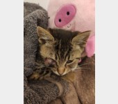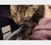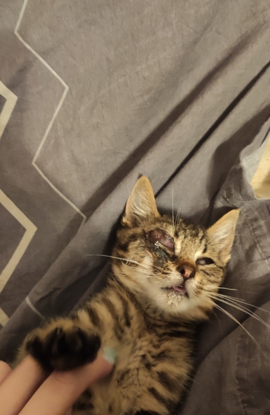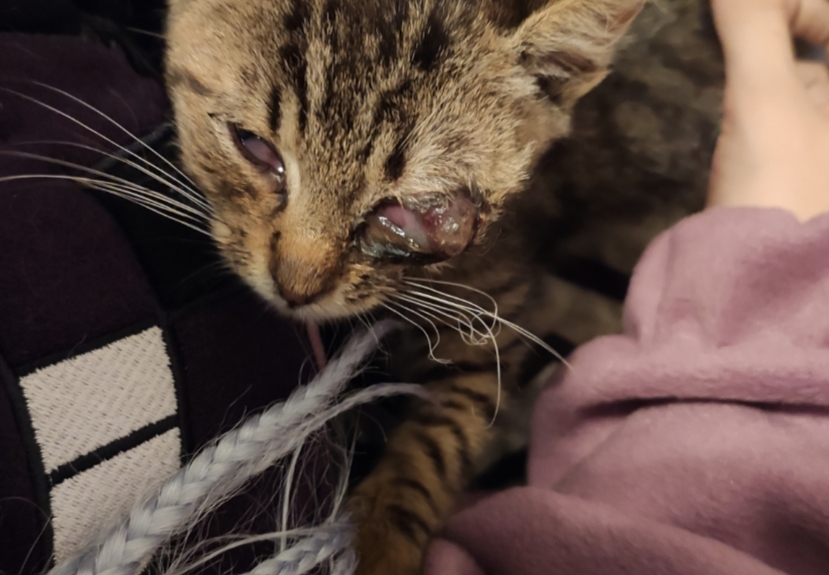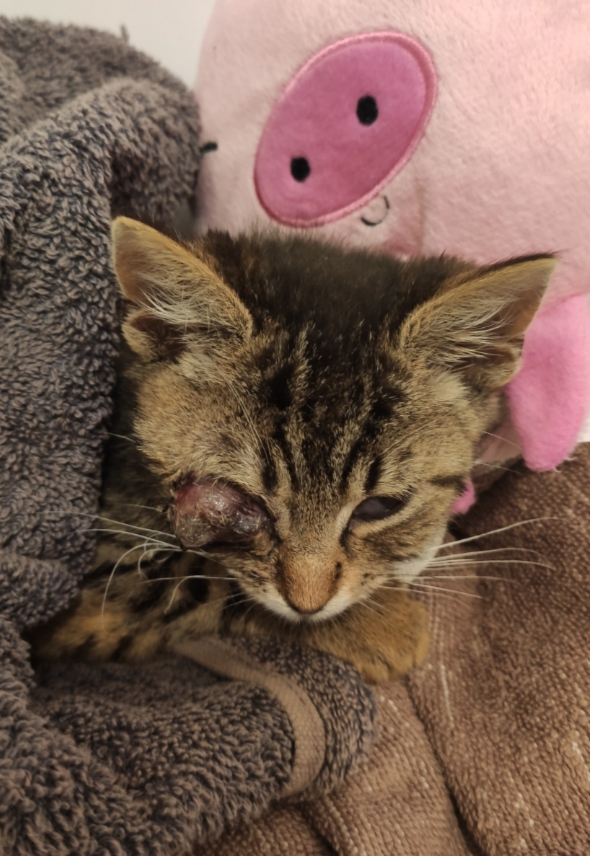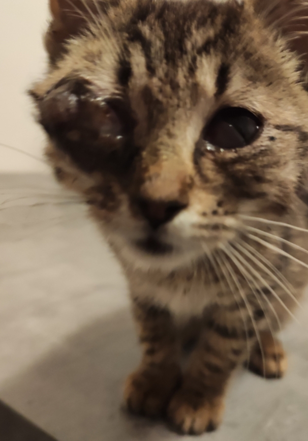 Proszę o pomoc dla kota z herpeswirozą. Mały Jake trafił do mnie tydzień temu i jak widać na zdjęciu został znaleziony z poważnie uszkodzonym oczkiem. Ma dopiero trzy miesiące. Jesteśmy po kilku wizytach u weterynarza oraz po badaniu u okulisty zwierzęcego. Bierze antybiotyk oraz kilka innych leków, ale nie są one w stanie wyleczyć go do końca. Mamy pewność, że maluch nie odzyska już wzroku na chore oczko, dlatego ważne jest, żeby jak najszybciej je usunąć, by wirus nie rozprzestrzeniał się dalej. Mimo wielkiego bólu, który kociak odczuwa, Jake jest pełen życia i zawsze gotów do zabawy. Proszę o wsparcie, aby mógł cieszyć się życiem i zdrowiem.